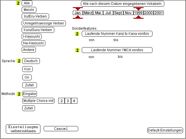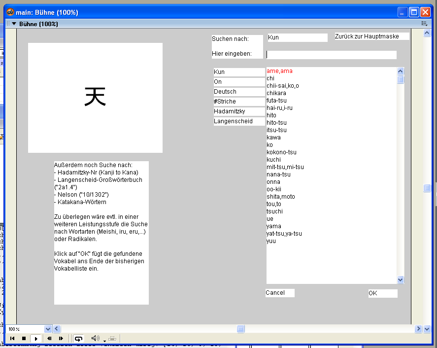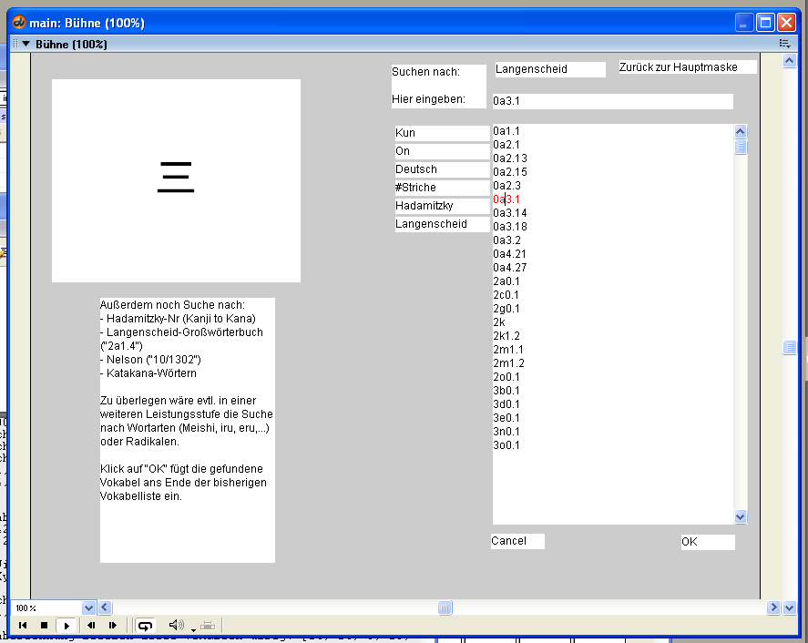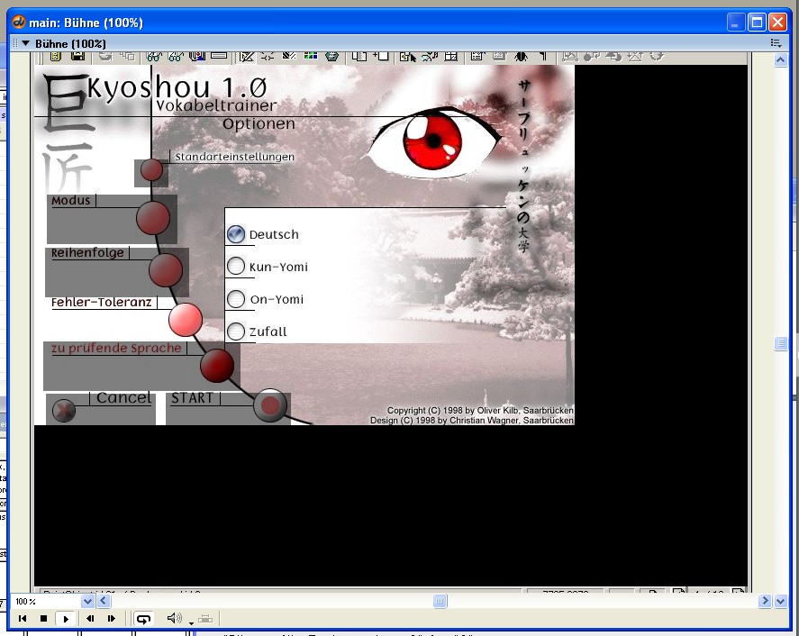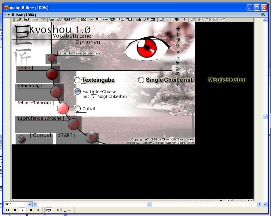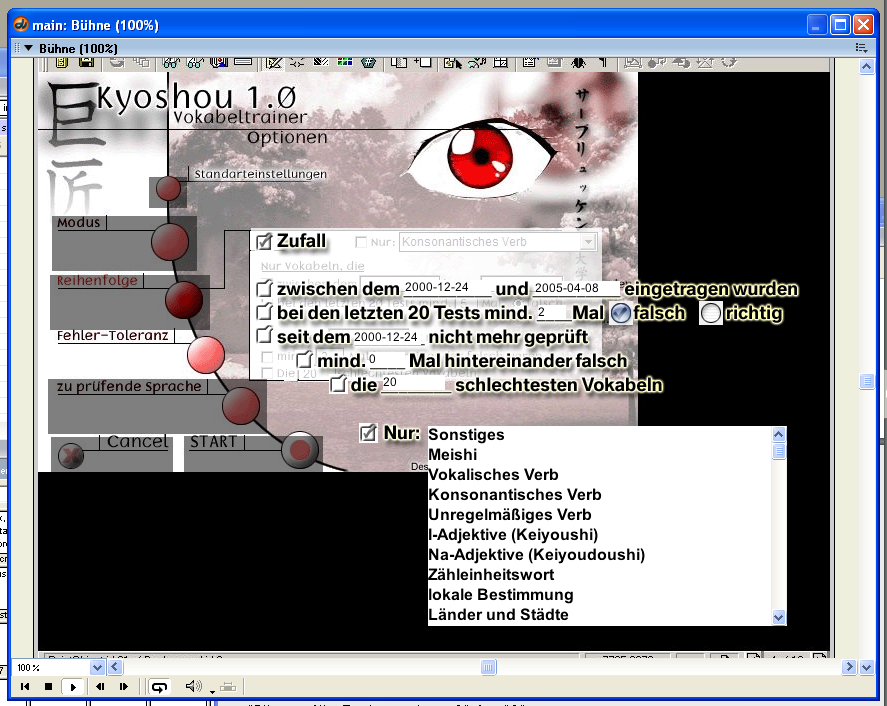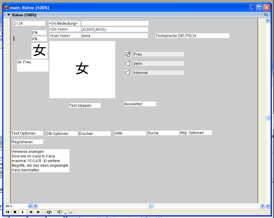 Dennoch war es möglich, schon mit dieser Version ansprechende Applikationen zu programmieren. Und so entstand zwischen März und Mai 2000 die hier dargestellte Studie, in der die wichtigsten Dinge der Toolbook-Version schon funktionierten: Anhand selbst festgelegter Testeinstellungen wird eine Vokabeltestmenge berechnet und pro Vokabel konnten auch Kanjis angezeigt werden – allerdings noch als Grafik, denn auch der Macromedia Director konnte damals noch keine Unicodezeichen darstellen.