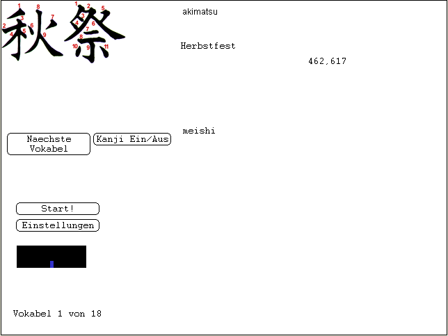Wie man links sehen kann, wurde die Version von 2003 deutlich weiter entwickelt, und alle Funktionen der in Teil I und Teil II beschriebenen ursprünglichen Version von 1998/99 standen erneut zur Verfügung – sogar mit neuen Features: Eine Radikal-Anzeige war integriert, und (im Screenshot nicht zu erkennen) es gab einen Modus, bei dem man einfach nur durch die Vokabeln durchblätterte, ohne Test.