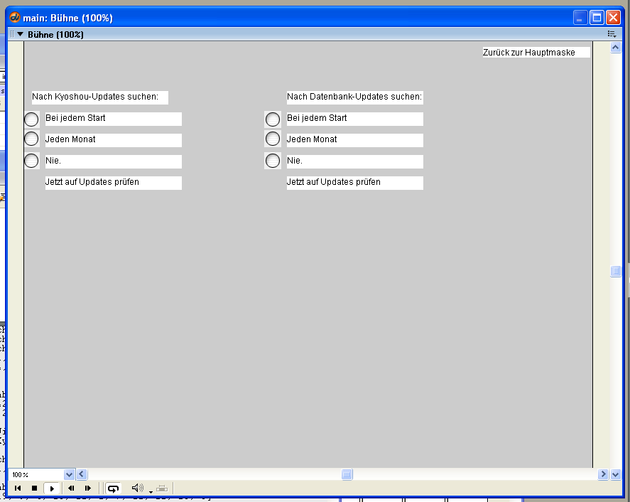 Aber: Unicode konnte Director noch immer nicht, und somit auch keine Darstellung von Kanji als Text… wirklich? Nachdem ich meine Wurzeln in der Demoszene habe, bei der es immer darum ging, mit Tricks Unmögliches zu ermöglichen, war das eher eine Herausforderung. Und ich schaffte es. Wie genau, spielt hier keine Rolle, aber es war ein Hin-und-Her zwischen dynamischem Textaustausch auf Dateiebene, Javascript und der Einbettung von HTML-Seiten in einem Web-Xtra. Von dieser Version im Oktober 2003 gibt es in der Director 8 Version nur eine nennenswerte Maske; es war eher ein Proof-of-Concept für mich.